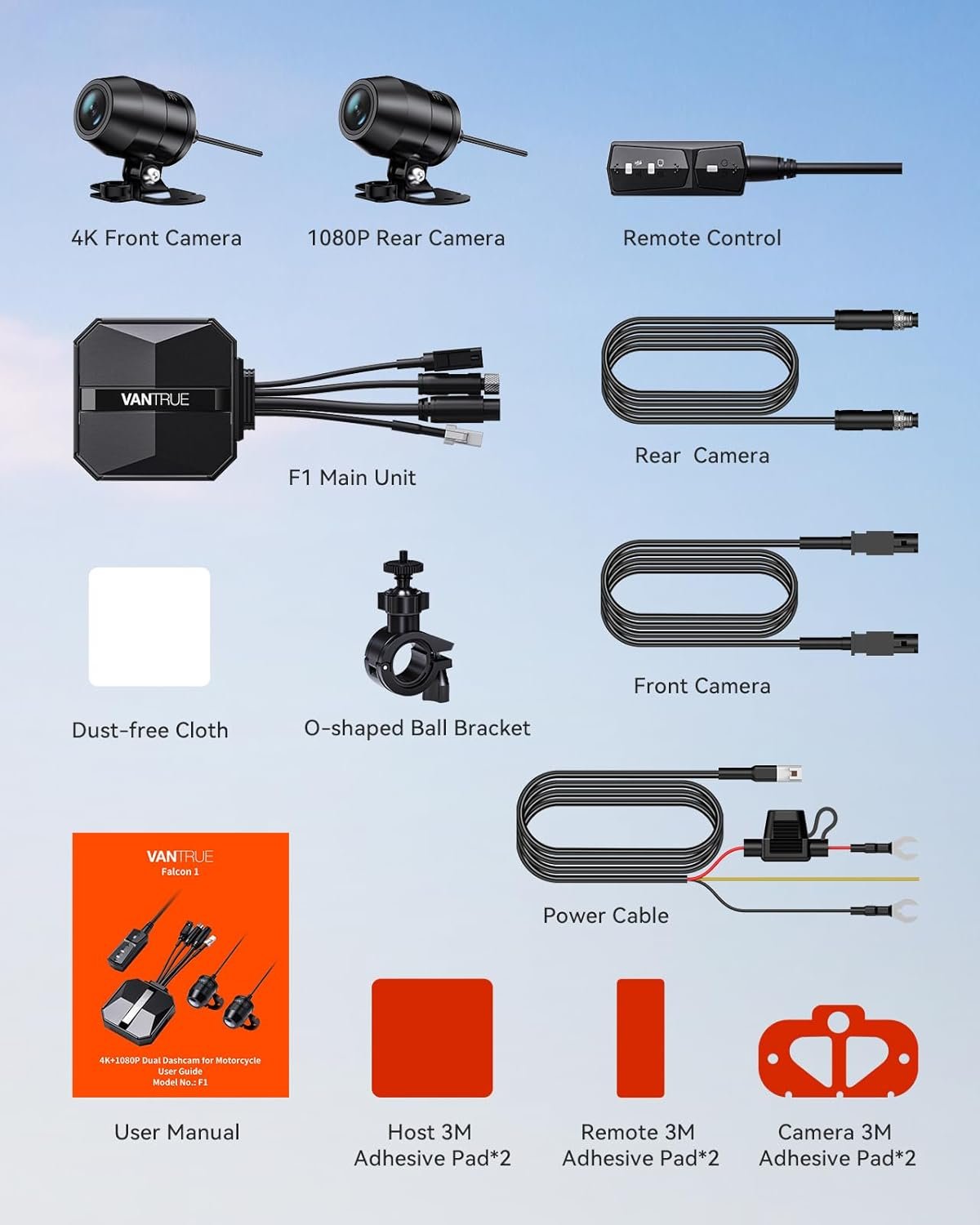 [ Full Body IP67 Waterproof ] With IP67 waterproof and dustproof design, F1 front and rear motorcycle dash cam can help you record every moment of your cycling journey, no matter it is rainy, snowy or dusty. All accessories and cameras of the VANTRUE F1 motorcycle dash cam are waterproof and dustproof.