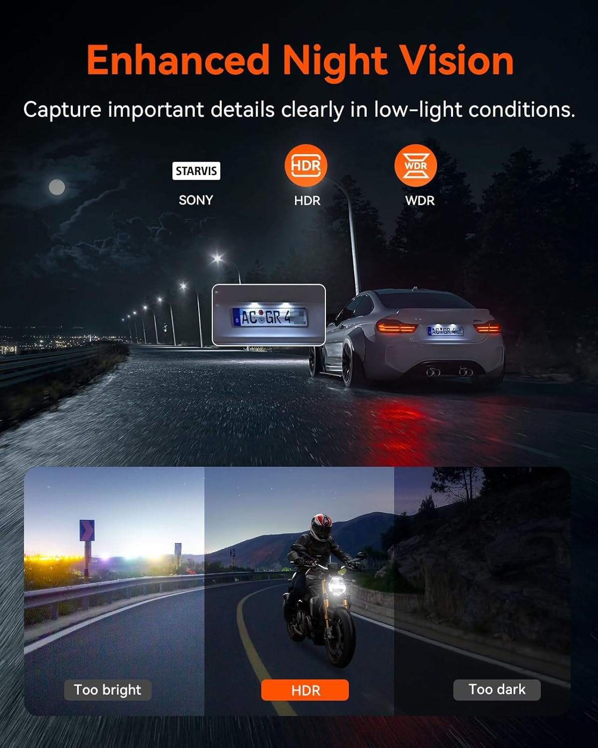 [ 4K + 1080P Dual Recording & 160° Wide Viewing Angle ] With the technology of STARVIS, F1 motorcycle front and rear cameras simultaneously record up to 4K + 1080P 30fps resolution, capturing every wonderful moment on the road very clearly. The 160° front camera and 160° rear camera greatly reduce blind spots and provide more than 3 lanes of traffic to capture more detail.