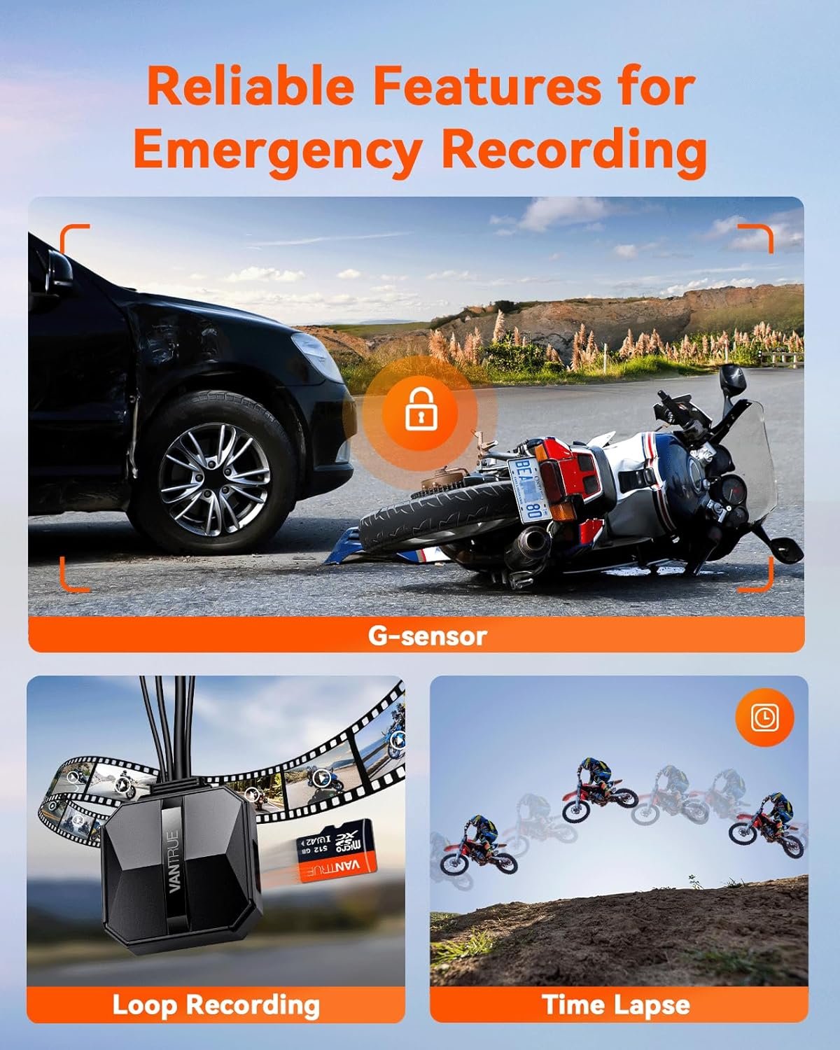 [ Built-in Adjustable G-sensor & Loop Recording ] Once the built-in 3-axis G-sensor detects a collision, the current video will be locked to the event folder, ensuring that important footage is protected. When the memory card is full, the new video will automatically overwrite the oldest video. Supports up to 512GB memory card (Vantrue SD card recommended, ASIN: B09SNRFSS3).