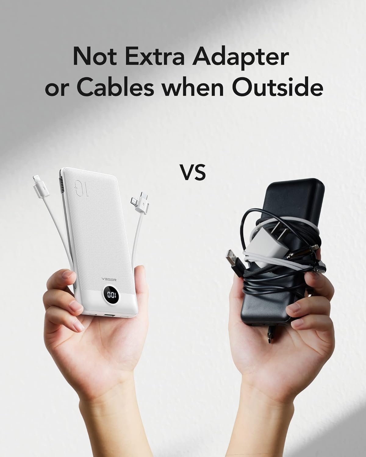 VEGER Portable Charger for iPhone Built in Cables and Wall Plug, 10000mah Slim Fast Charging USB C Power Bank, Travel Essential Battery Pack Compatible with iPhones, iPad, Samsung More Devices(White)