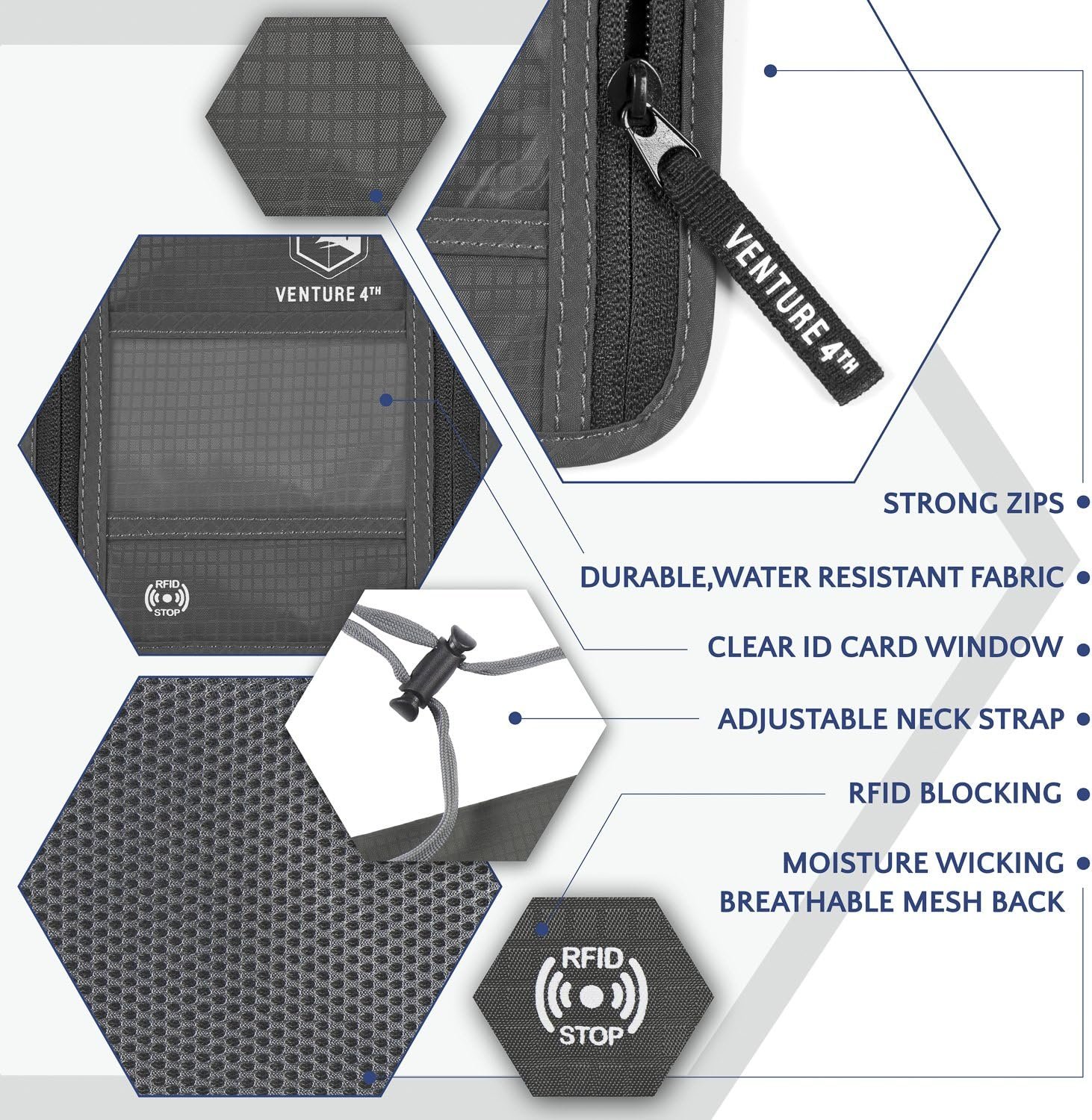 VENTURE 4TH Passport Holder Neck Wallet with RFID Blocking Nylon Lining – Hidden Neck Pouch for Travel (Gray)