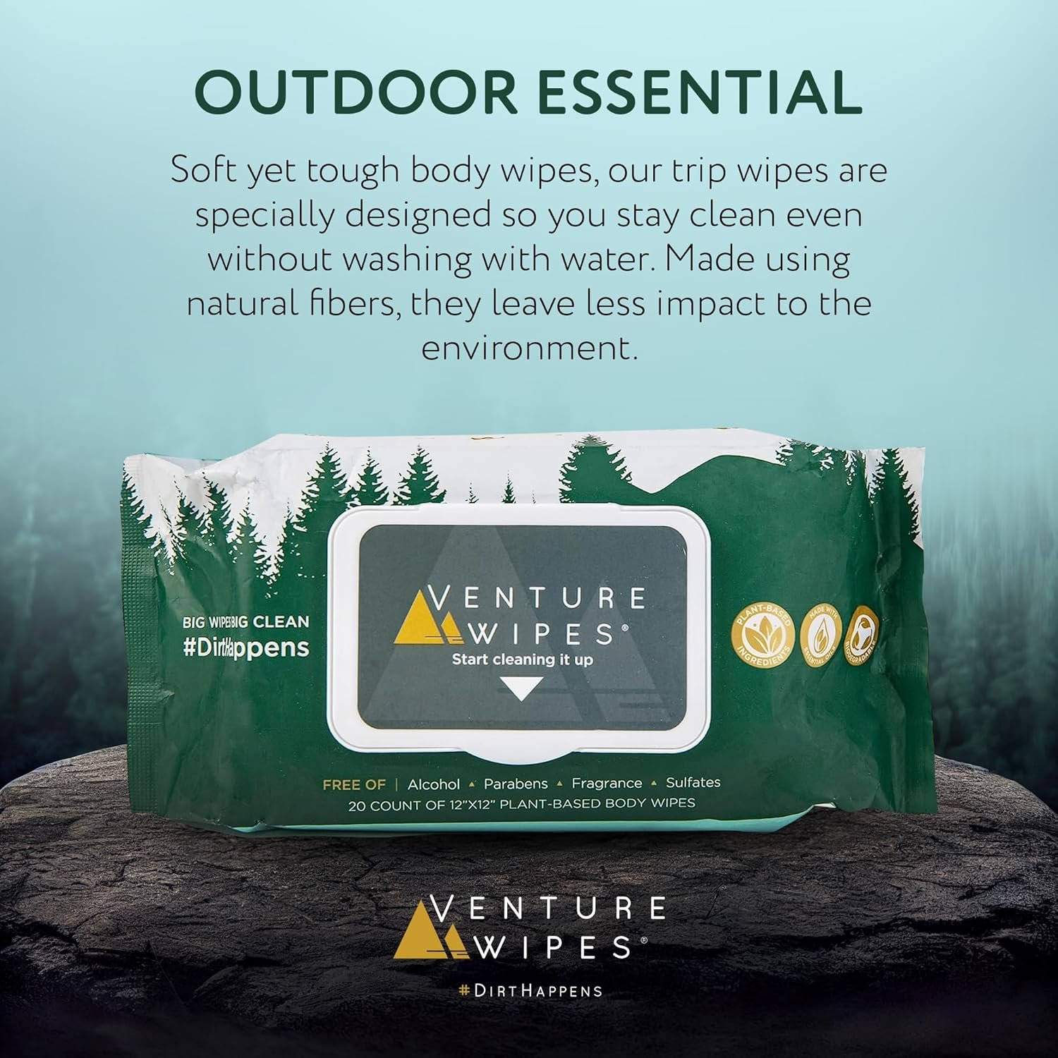 Venture Wipes Large Shower & Workout Wipes – Biodegradable with Aloe, Vitamin E & Tea Tree Oil – Adults & Travel Essentials – 20 Count Pull Pack