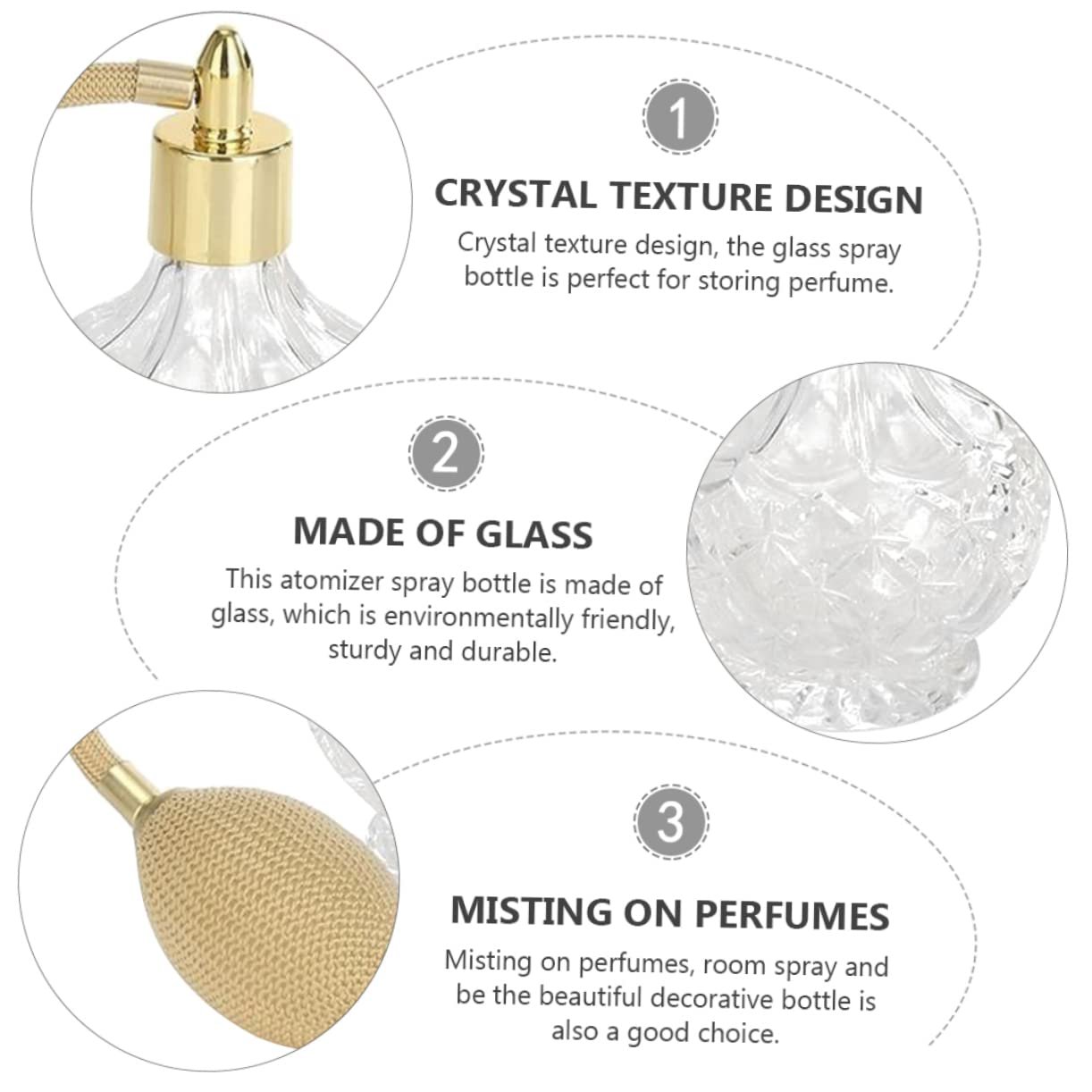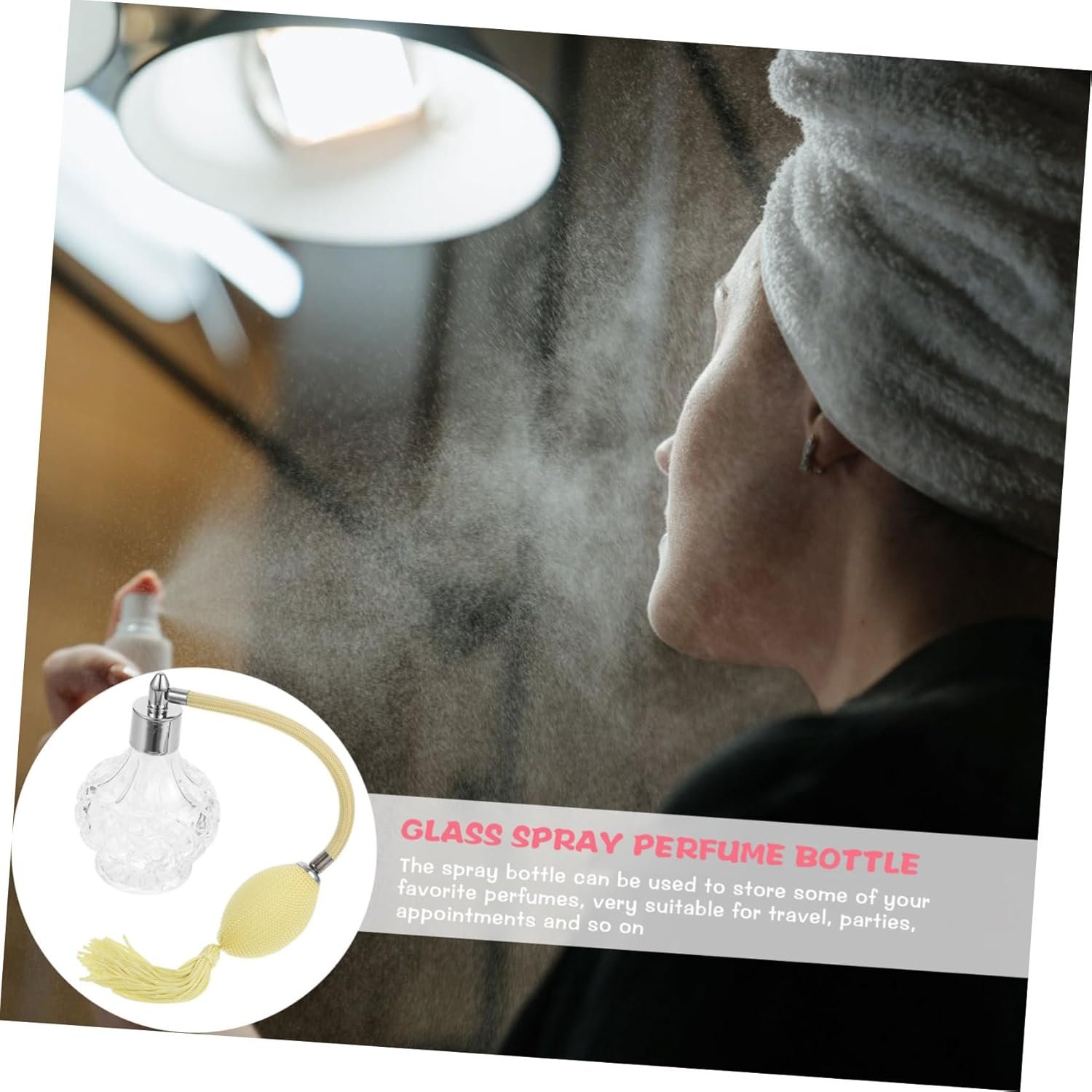 Perfume This beautiful, yet functional, refillable spray bottle is for your vanity or dresser.with Made of material with design, and as a home or travel supply.Glass Spray Bottle Fine atomization, fine workmanship, and to use