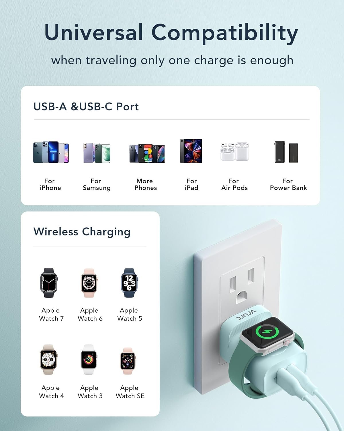 🎁【Portable iWatch Charger for Apple Watch】Unique cordless charger for Apple Watch series, equipped with a 2.5W magnetic wireless iWatch charger compatible with Apple Watch Series 10/9/8/7/6/SE/5/4/3/2/1/UItra/UItra 2, no extra cables need and you can direclty charging for your iWatch. perfect for travel charging block.(wireless charger can’t charging for Samsung Watch)