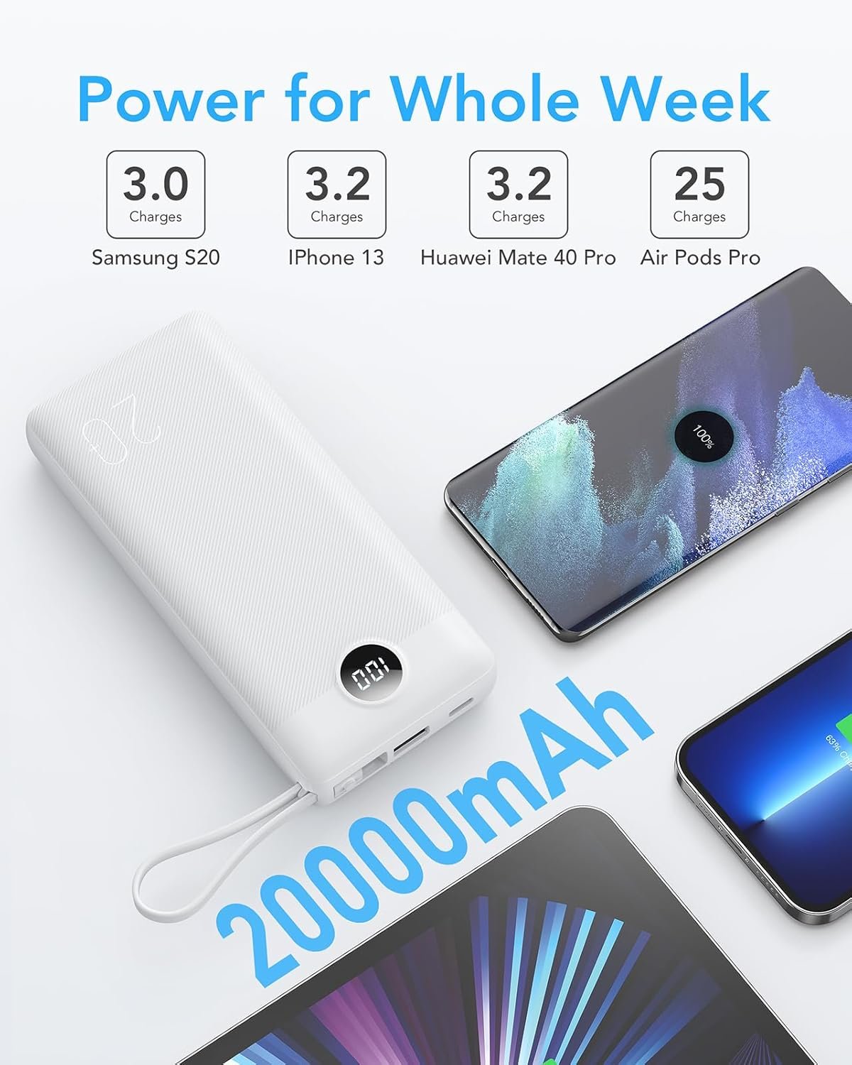 VRURC Portable Charger 20000mAh, Built-in Cable Fast Charging Power Bank, PD QC 3.0 Travel Essentials Battery Pack, 4 Output & 2 Input Phone Charger for iPhone,Samsung, Android-White