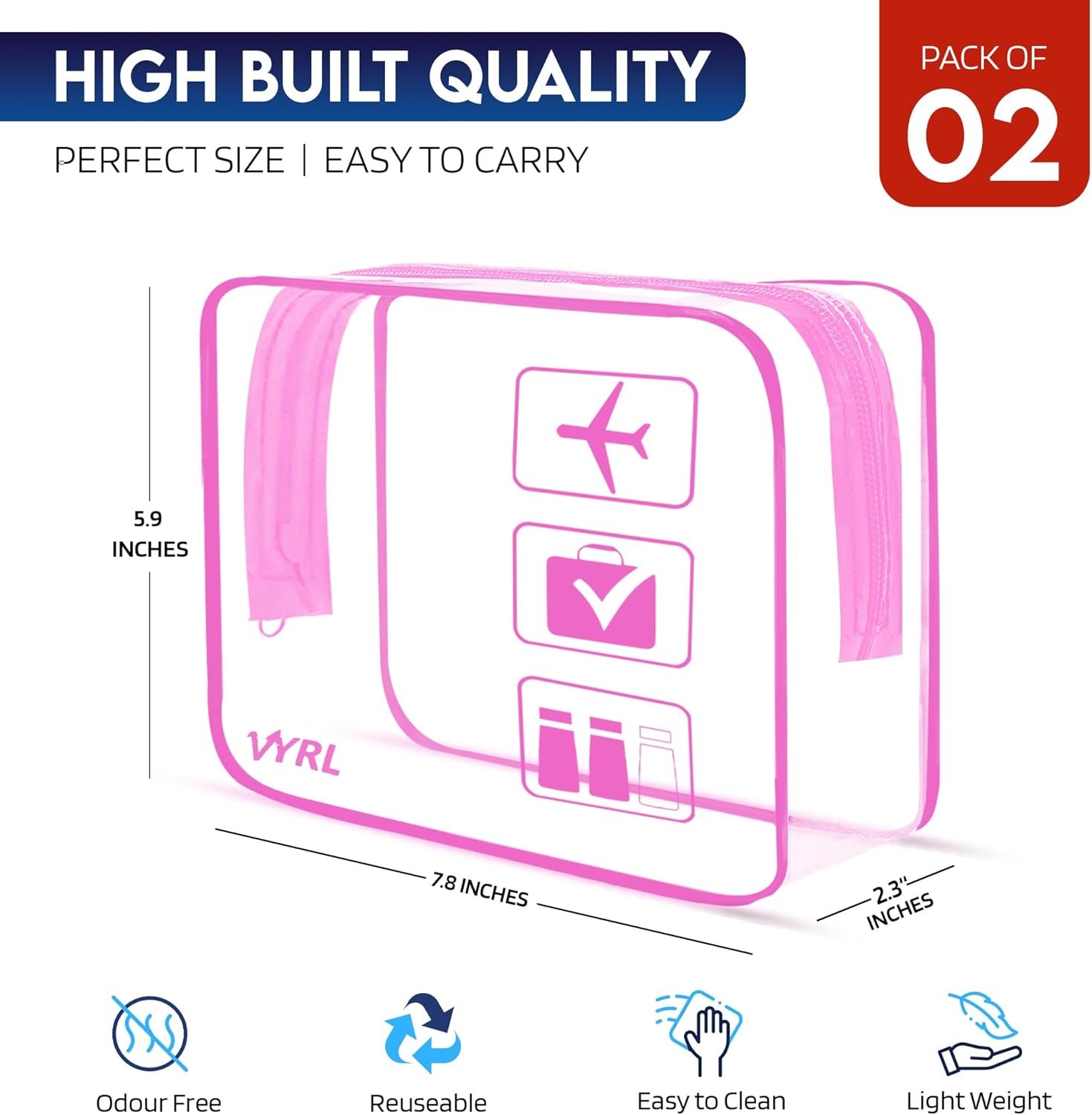 VYRL 2 Pack Clear Makeup Bag – Quart Size 3-1-1 TSA Approved Toiletry Bag with Zipper – Water-Resistant Durable PVC Clear Toiletry Bag for Carry-on Airport Travel Accessories – Rose Pink