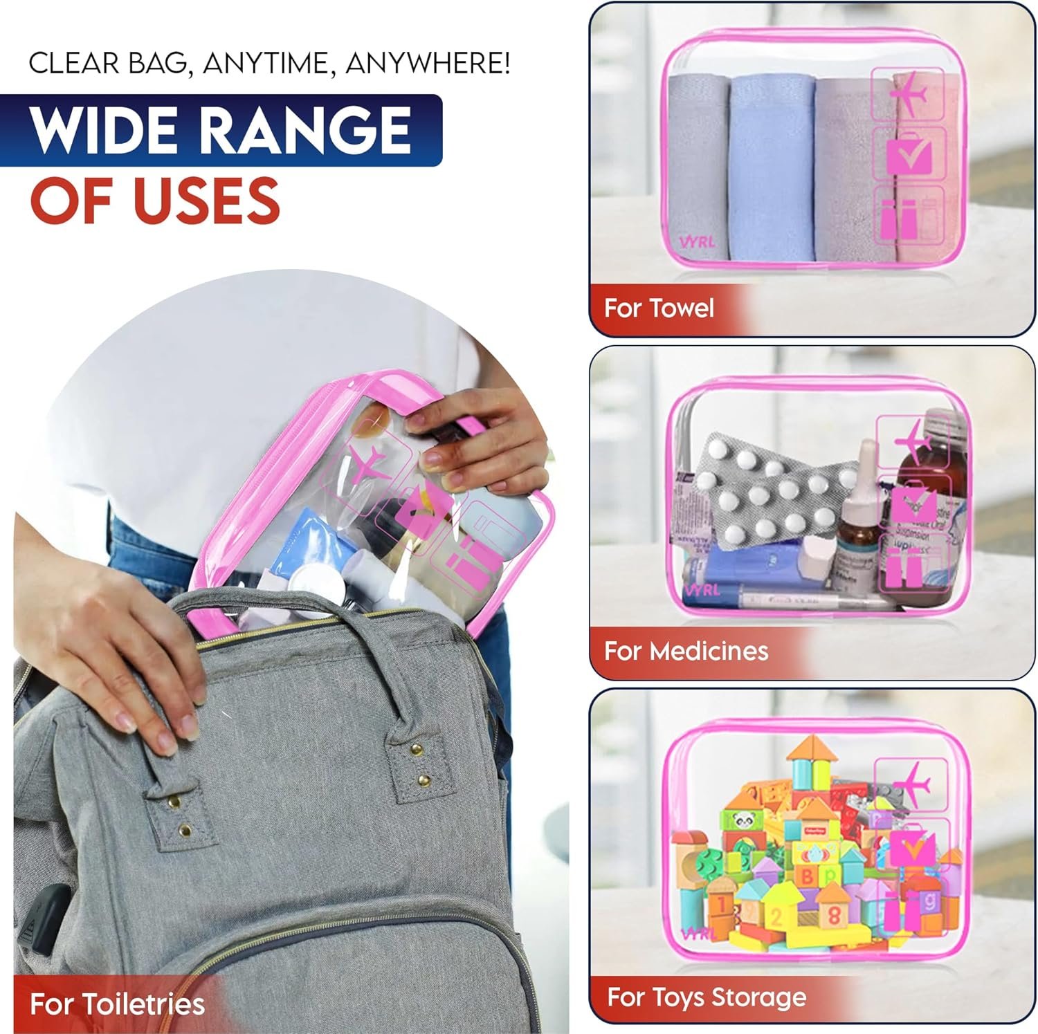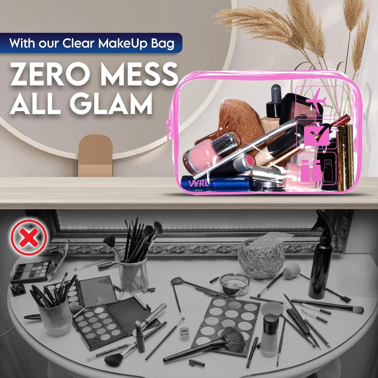 🔥𝗧𝗦𝗔-𝗔𝗽𝗽𝗿𝗼𝘃𝗲𝗱: VYRL 8.46 x 6.3 x 1.18 inches clear travel bags for toiletries strictly adhere to the TSA 3-1-1 liquids rule. The quart-size transparent clear cosmetic bag design ensures a swift pass through airport security & easily spot your essentials in a breeze.