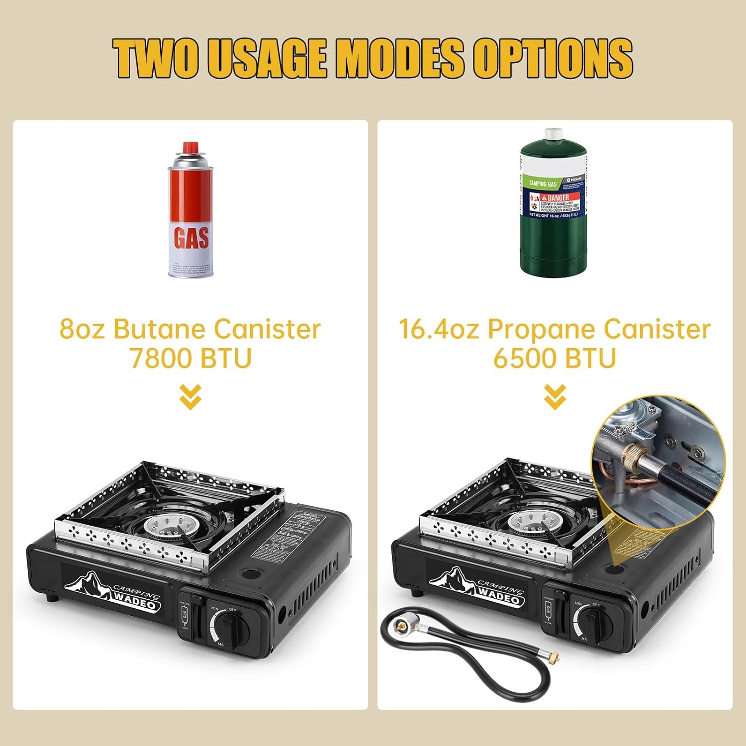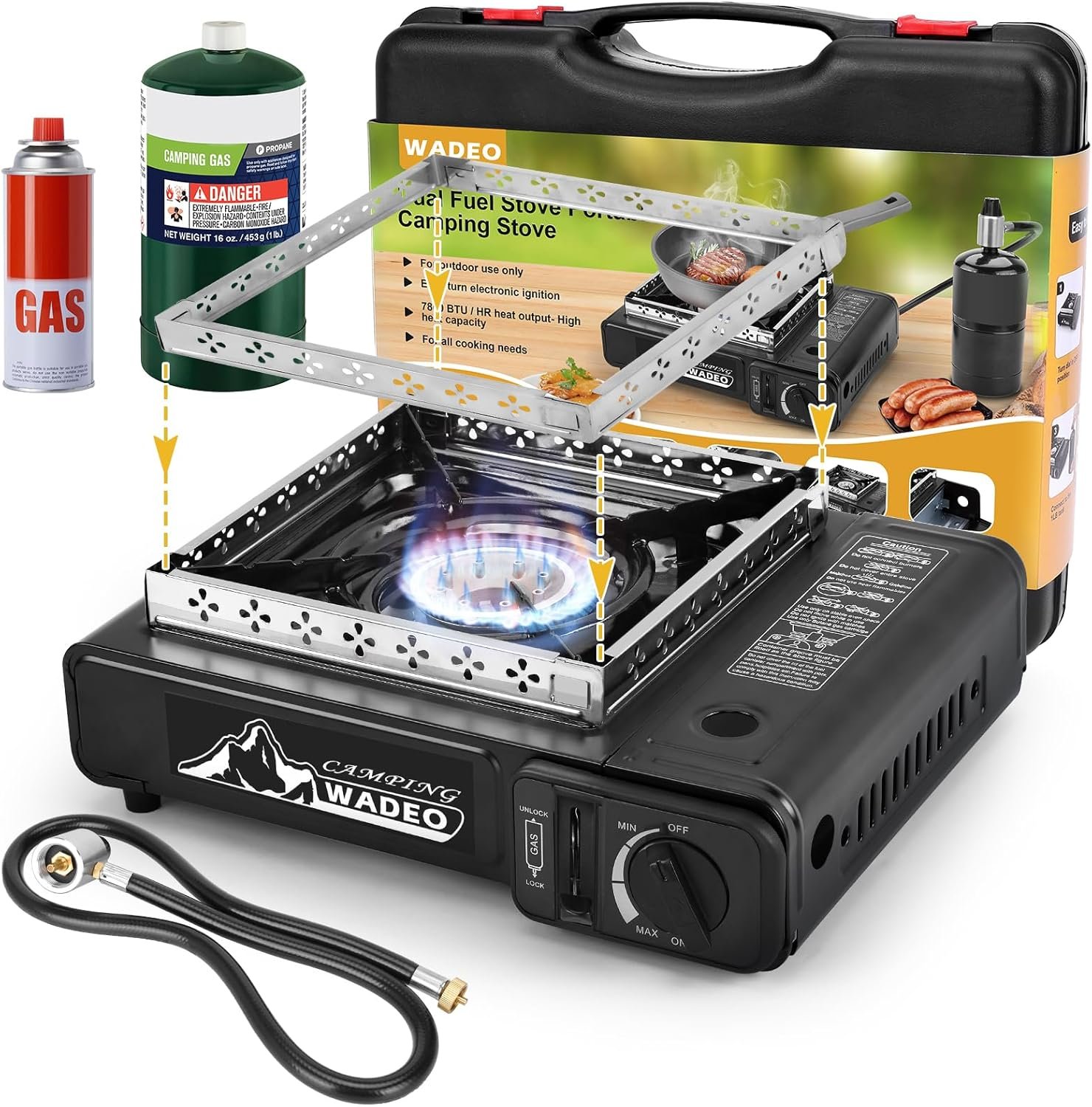 WADEO Dual Fuel Portable Camping Stove with Propane Regulator Hose, Portable Gas Stove Windshield Camp Stove for Camping Hiking Party