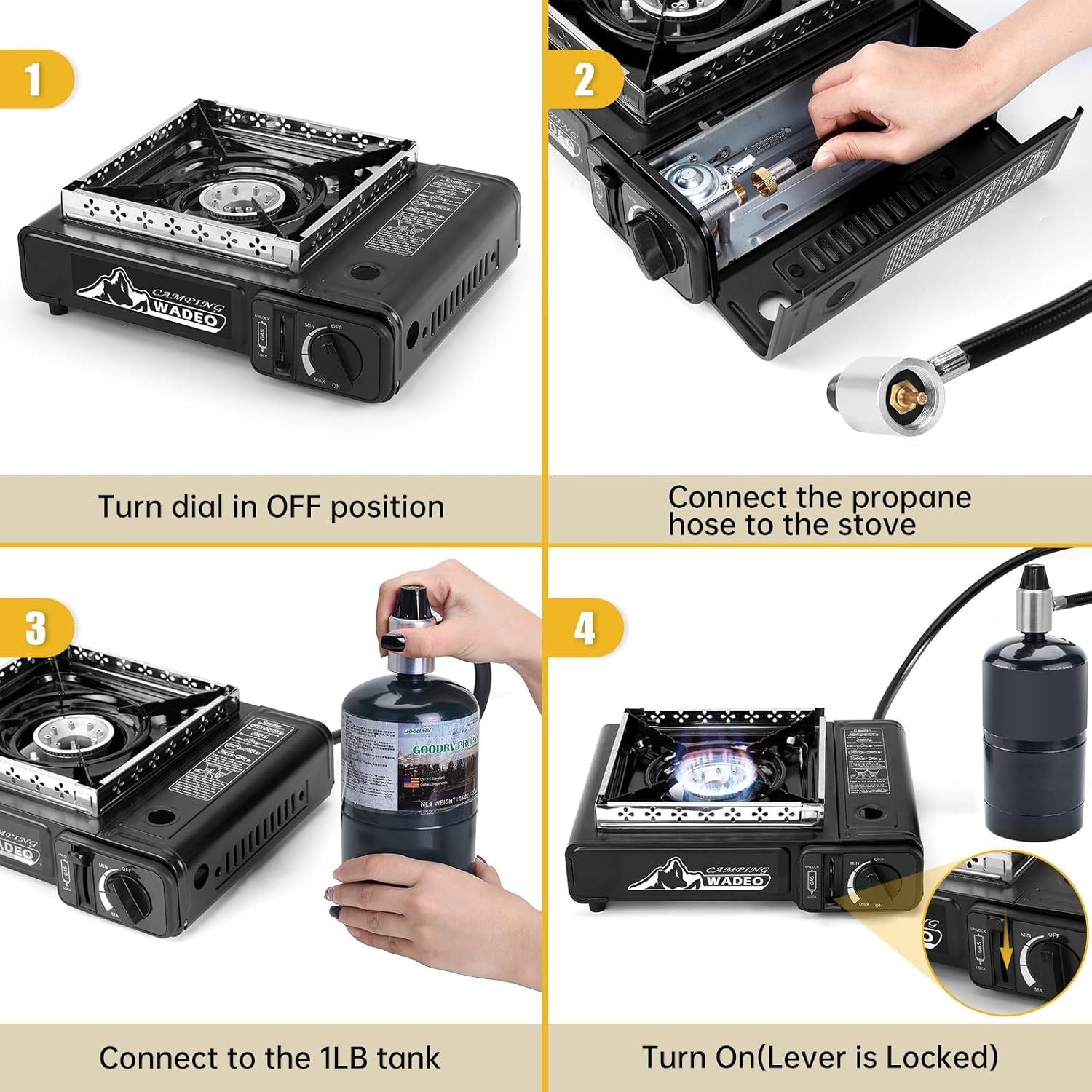 Piezo Ignition and Flame Control: Our portable stove propane has a piezo-electric ignition, eliminating the need for matches or lighters. Simply lock the gas canister in position and turn the control knob to the end to ignite the stove with a clicking sound. The flame adjustment knob allows you to easily control the flame size according to your needs.