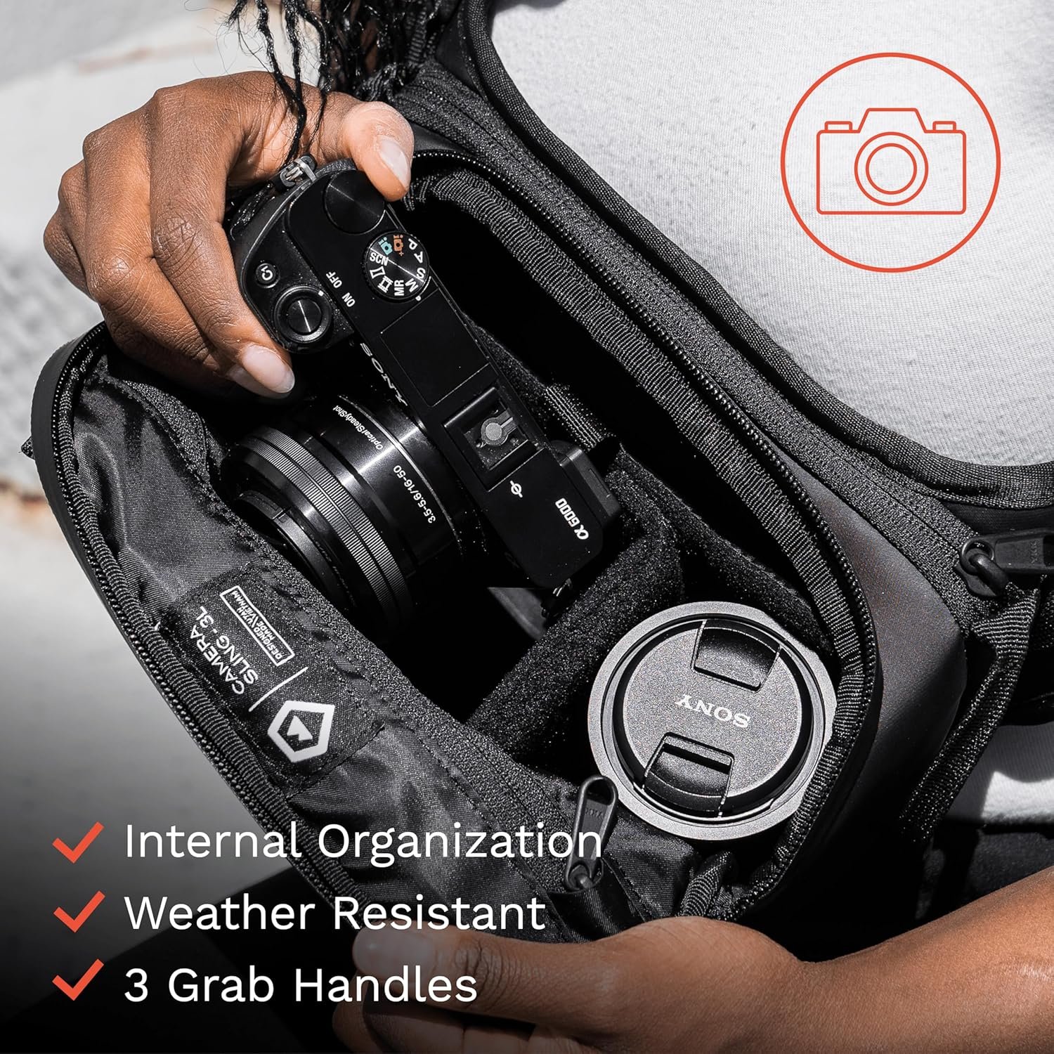 Quick Access & Easy Carry: Includes a side camera access and versatile carry options, including a top handle and a padded, adjustable sling strap, ensuring you can grab your camera accessories on the go and carry them comfortably throughout the day