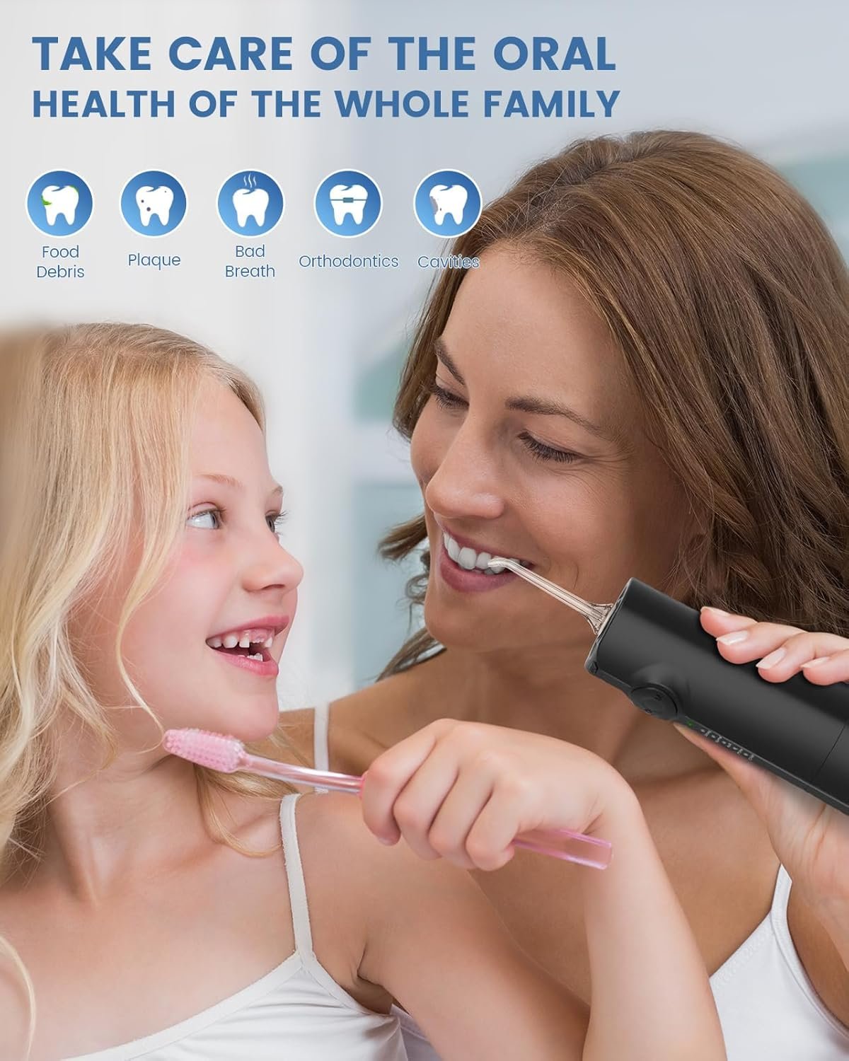 Considerate 5 modes: Our water picks for teeth cleaning and flossing upgraded to 5 water pressure modes, when using at home, you can choose the strength according to the oral condition, the first time you use it is recommended to choose the soft mode. Specially upgraded to create a child mode, you can easily give your child a deep cleaning of the teeth at home. Effectively prevent tooth decay, plaque, calculus, bleeding gums.