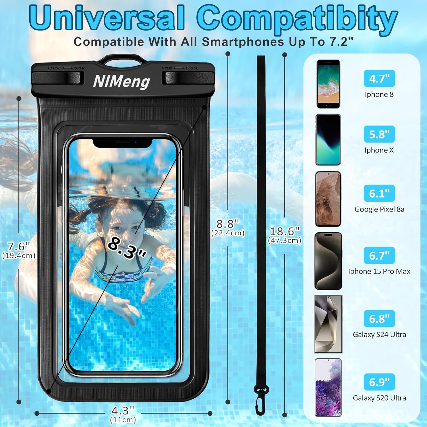 Waterproof phone Pouch Capacity: It can accommodate not only a phone but also an ID card, credit cards, cash, and keys. Dimensions: 8.2 inches x 4.5 inches, compatible with phones up to 7.2 inches; ideal waterproof phone protection bag for Apple iPhone, Samsung, and phones up to 7.2 inches.