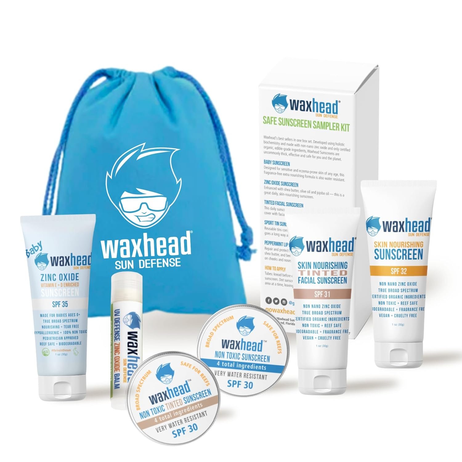 Explore Waxhead’s best selling zinc sunscreen s in one kit! This collection contains sample sizes of our best eco friendly sunscreen s. NO oxybenzone. NO benzene. NO junk chemicals at all. Everything is rated #1 BY EWG Sunscreen Guide.