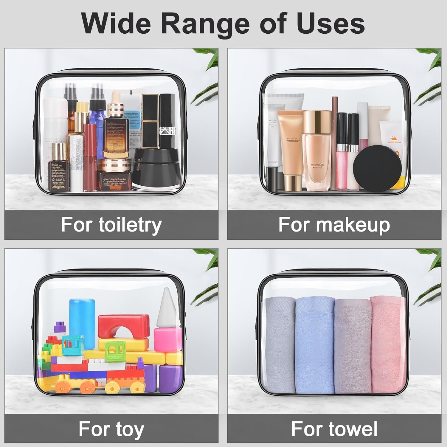 Waterproof and Leak-proof: The plastic cosmetic bag is made of PVC material. The surface is waterproof and the inner layer can prevent the liquid in the bottle from leaking and wetting the suitcase.