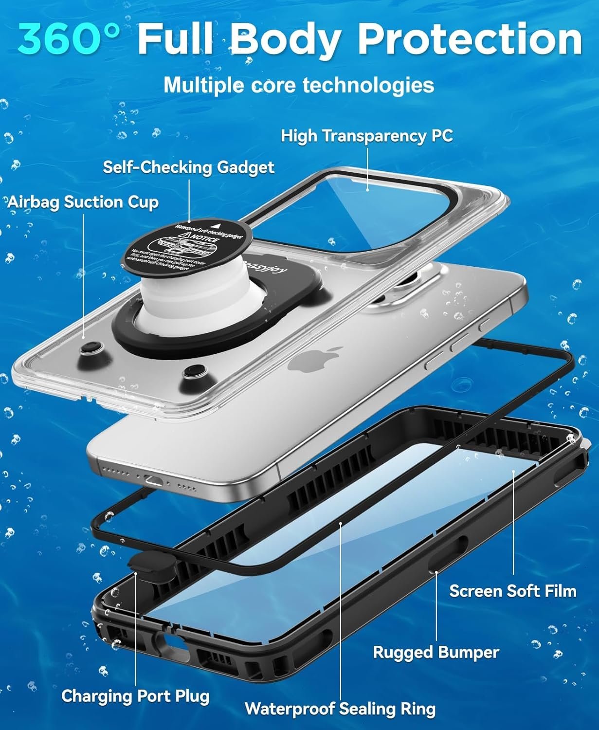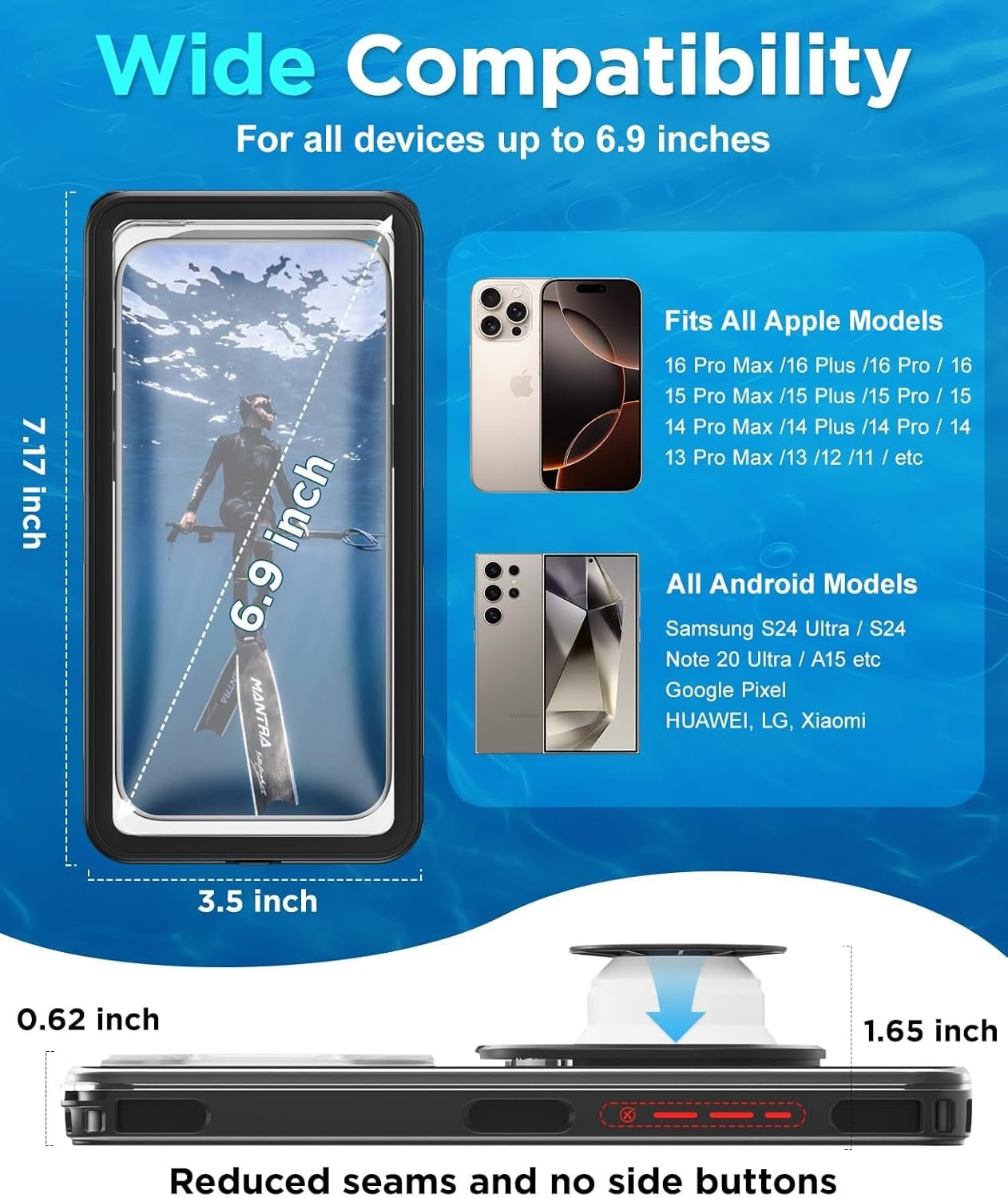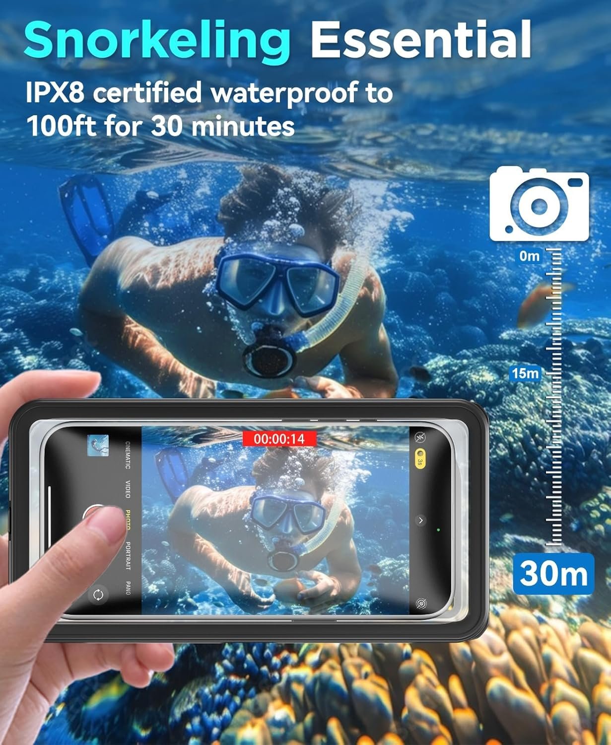 Why you need pro snorkeling phone case ———— More sealed design than other waterproof phone cases. Built for snorkeling: more sensitive touch screen, clearer photos, works with all kinds of cell phones up to 6.9 inches