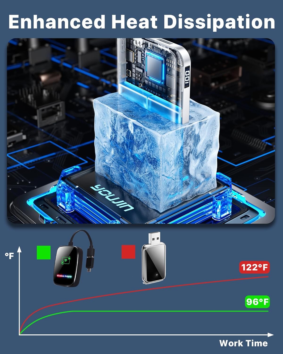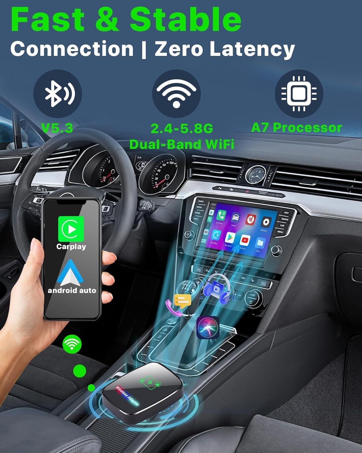 Fast & Stable Connection with 2.4-5.8GHz WiFi & v5.2 Bluetooth: Experience lag-free car play adapter thanks to dual-band WiFi (2.4G/5.8GHZ) and Bluetooth V5.2. Stream music, use navigation, and take calls without interruptions.