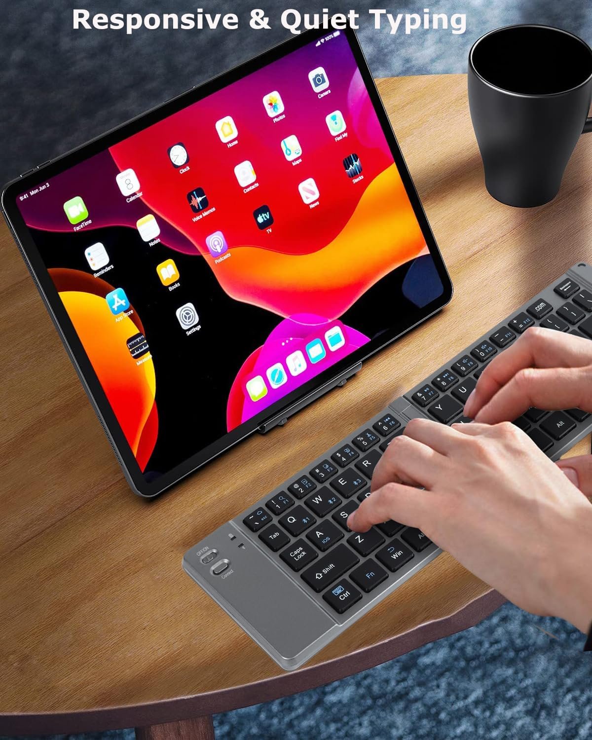 Responsive & Quiet Typing: The keys on this foldable rechargeable keyboard portable wireless keyboard travel keyboard for laptop offer a responsive and quiet typing experience, perfect for both work and leisure. Type discreetly without disturbing those around you