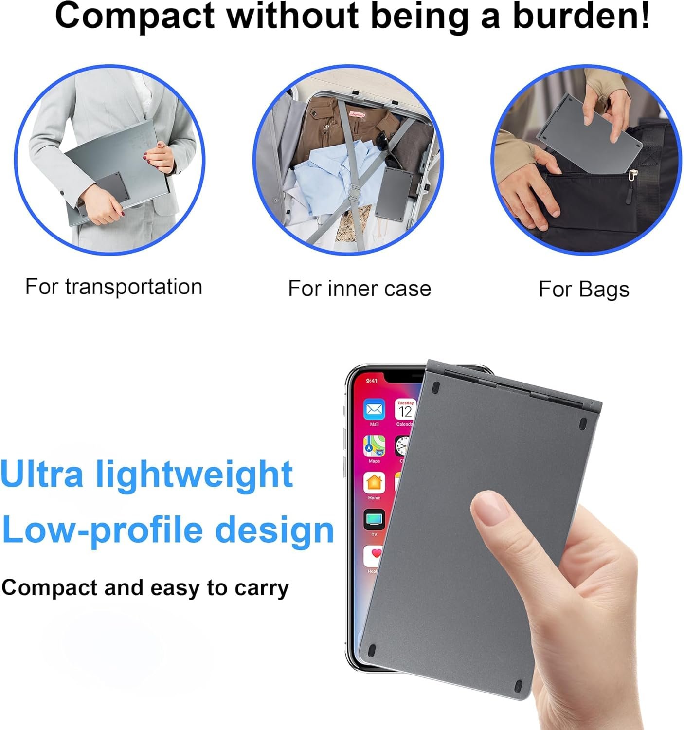 Universal Compatibility: This portable bluetooth keyboard is compatible with a wide range of devices including iOS, Android, Windows smartphones, tablets, and laptops. The bluetooth keyboard for ipad/ipad air/ipad pro/ipad mini/mac/samsung tablet/laptop/iphone/cell phone/computer/macbook/pixel tablet/galaxy tab s9 fe/galaxy tab s9 ultra/android adapts to your tech ecosystem effortlessly