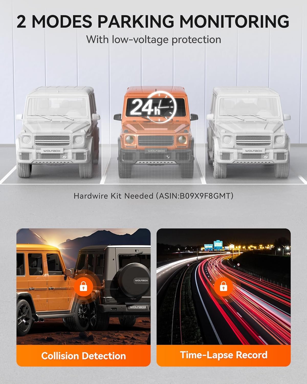 Support 24-hour parking monitoring to ensure your parking safety at any time (need to connect the hardware kit ASIN: B09X9F8GMT ).