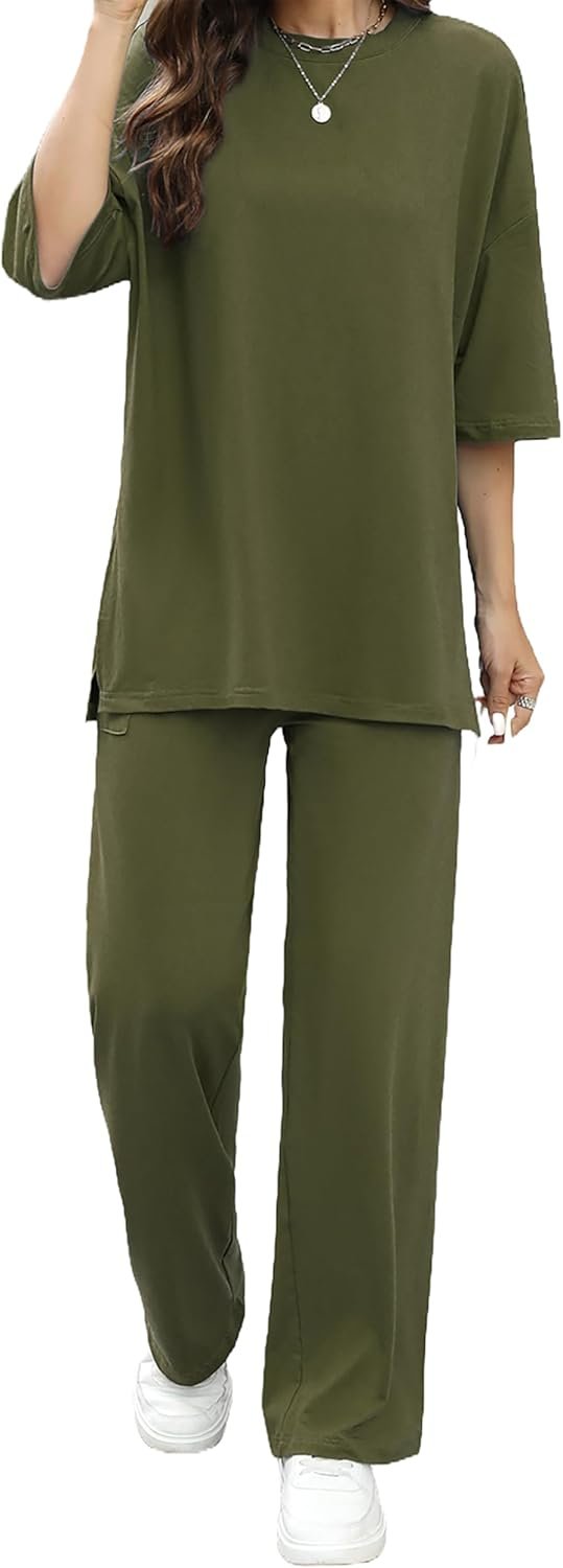 Womens 2 Piece Outfits Short Sleeve Set Wide Leg Pants Casual Trendy Pullover Lounge Set