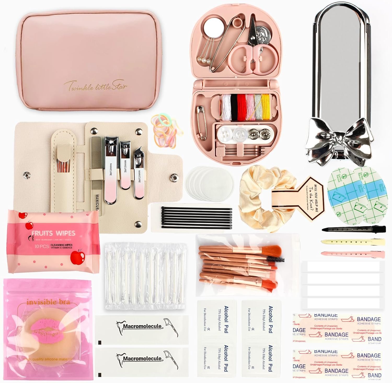HAIRBRUSH,MAKEUP BRUSH SET HAIR TIE AND SEWING KIT:The emergency kit comes with a silver retractable hair brush, it has a removable mirror and contains a satin hair tie. and multiple clear and black headbands. There are also 3 multi-color hairpins, 10 black thin hairpins, and the sewing kit has safety pins, sewing needles, 6 colors of thread, scissors, buttons, safety pins, and more. Finally you will also have a set of makeup brushes.