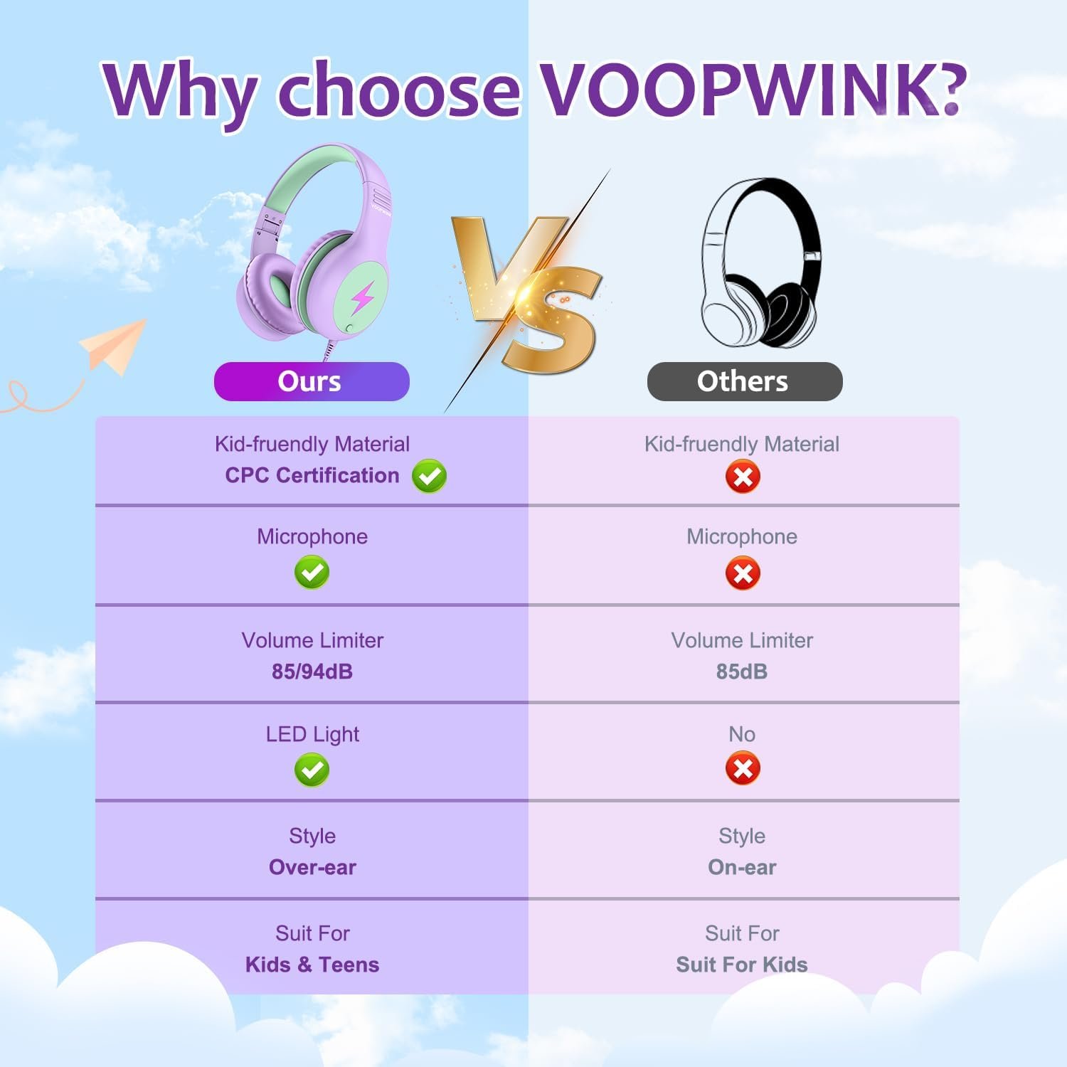 [ Stereo Sound & Built-in Microphone ] : Featuring 40mm drivers and premium audio tuning, VOOPWINK over ear headphones for kids offer clear, balanced stereo sound. The built-in mic makes online classes and video calls a breeze.