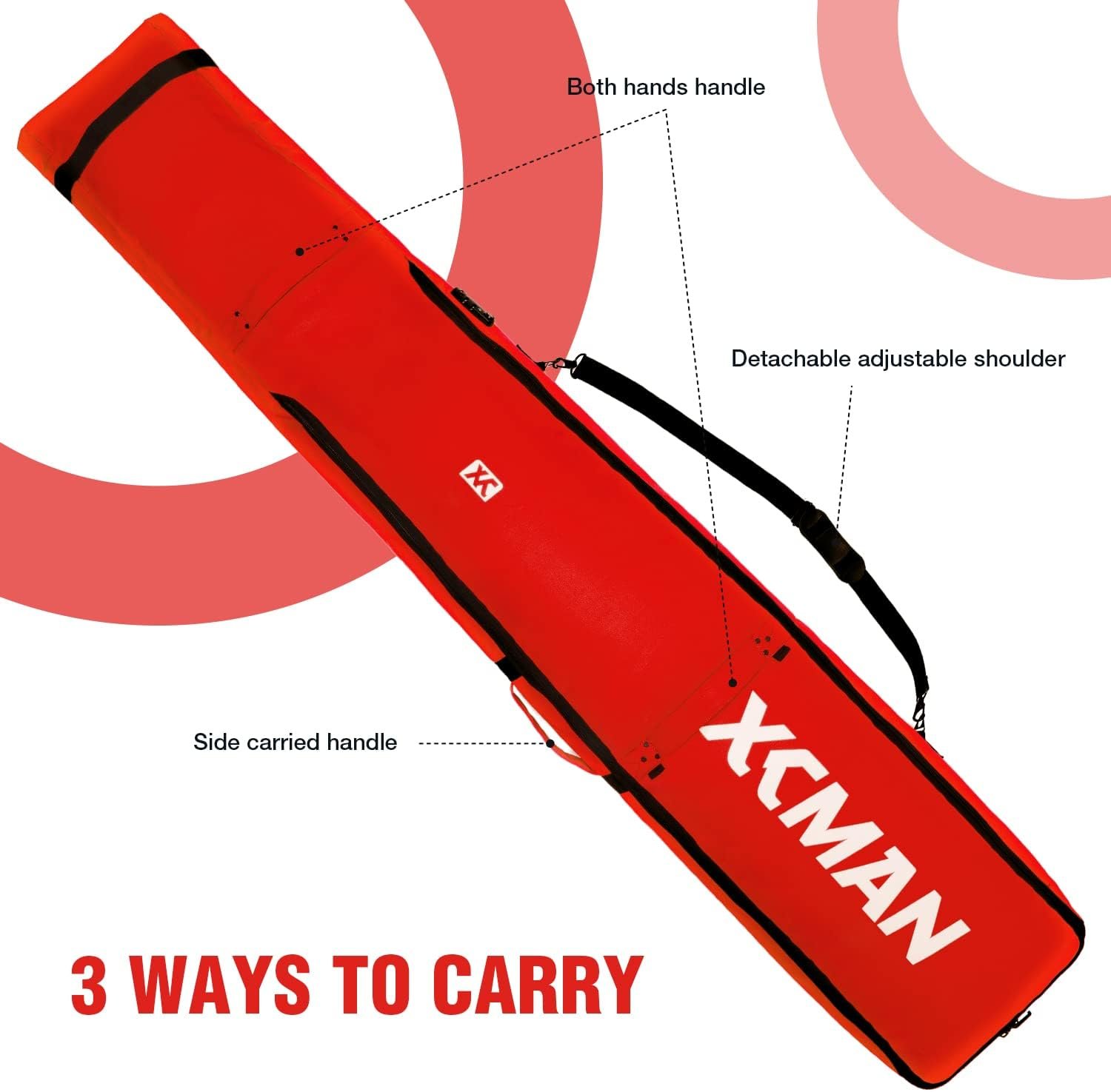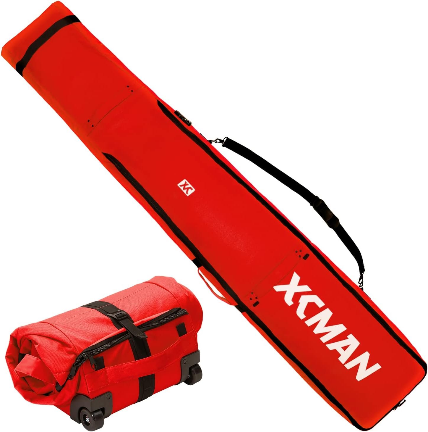XCMAN Padded Snowboard Wheels Bag with TSA Lock,Perfect for Road Trips and Air Plane Travel, Adjustable Lenght 57inch to 74.8inch, Fits 2 pair Skis or Snowboards