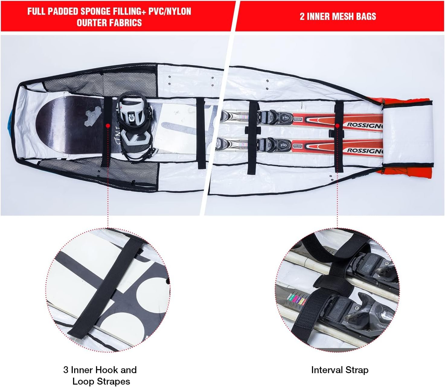 3.PERFECT STRUCTURE- 3 inner hook and loop straps is to bind snowboard firmly and protect it from damaging and clashing.An interval strap for exchanging snowboard to alpine ski quickly.2 mesh bags are put on the left&right to keep your keys,cups and other samll accessiors.Some special adjustable and release buckles,detachable hooks and straps ensure all your equipment in place and safe during transportation.