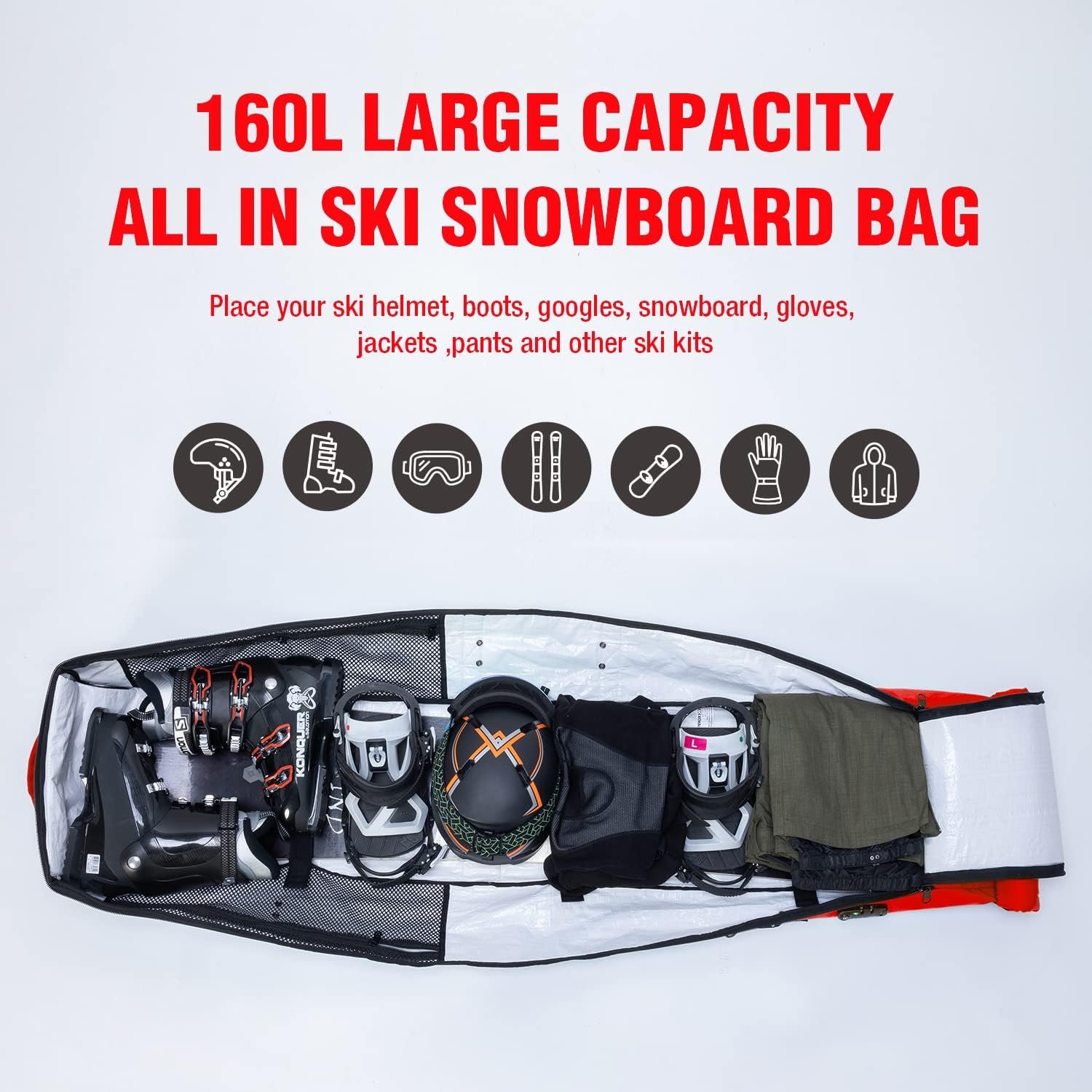 1.LARGE CAPACITY-The length of snowboard bag can be adjusted to 145-190cm (57-74.8 inches)length x 43 (16.92)width x 25 (9.84)depth. 160L inner capacity can keep everything you need: snowboards,ski boots,helmets,gloves,jackets,pants,goggles and other ski kits.