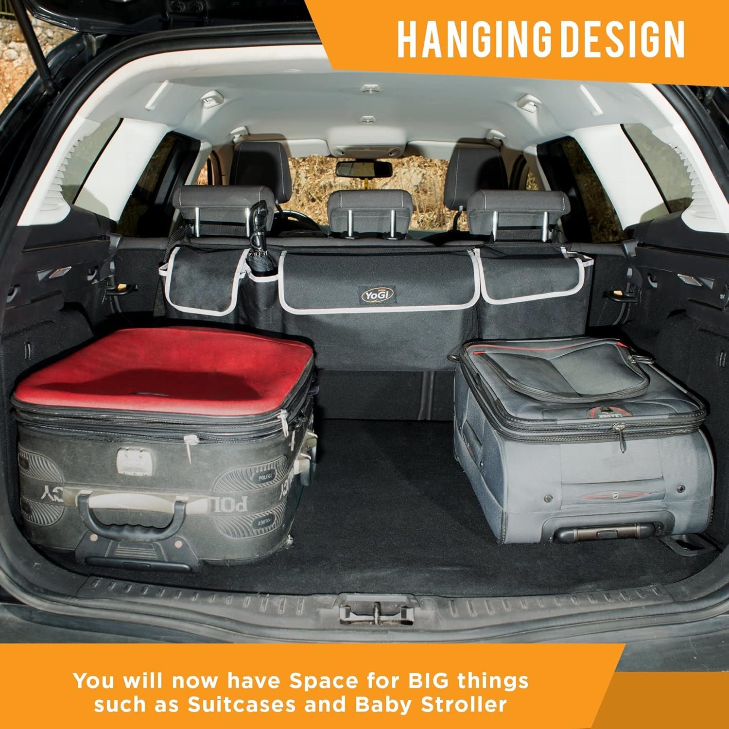 Our YoGi Prime Car storage will give you back your trunk floor space by conceal all Items that was thrown around in one place, hanged on your headrests and keep your trunk floor free.