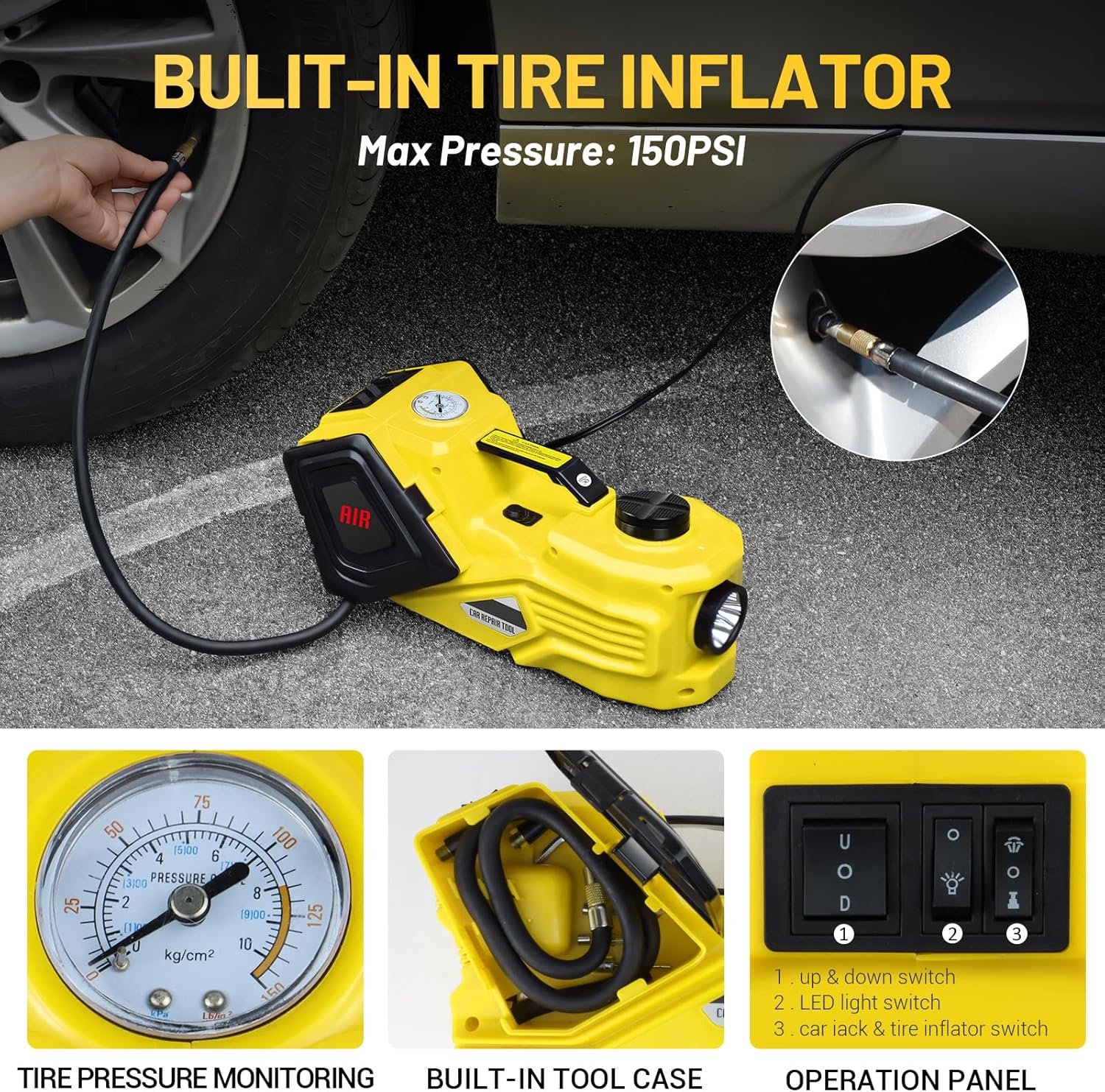 [Inflation Visualization]: This portable electric jack has a built-in air pump for fast and efficient tire inflation. The pressure gauge on the fuselage monitors tire pressure in real-time to ensure optimal performance with precise control at your fingertips.