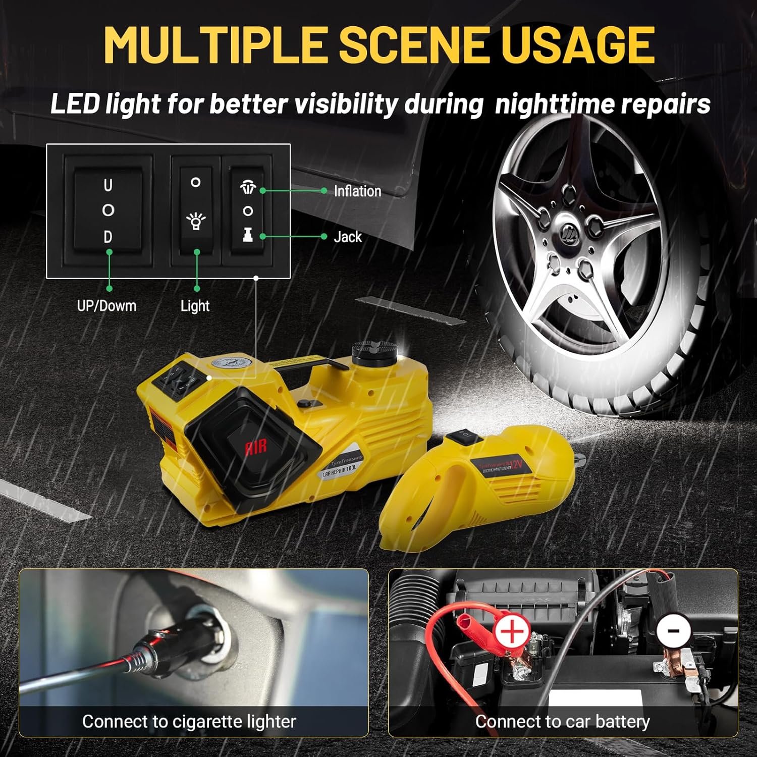 ZAISHANG Electric Car Jack Kit 5 Ton 12V (Lifting Range: 5.31-14.17 inch) with Impact Wrench, Inflator Pump and LED Light, for SUV/Truck/Sport Cars/Sedans/EVs Tire Inflation and Emergency Tire Change