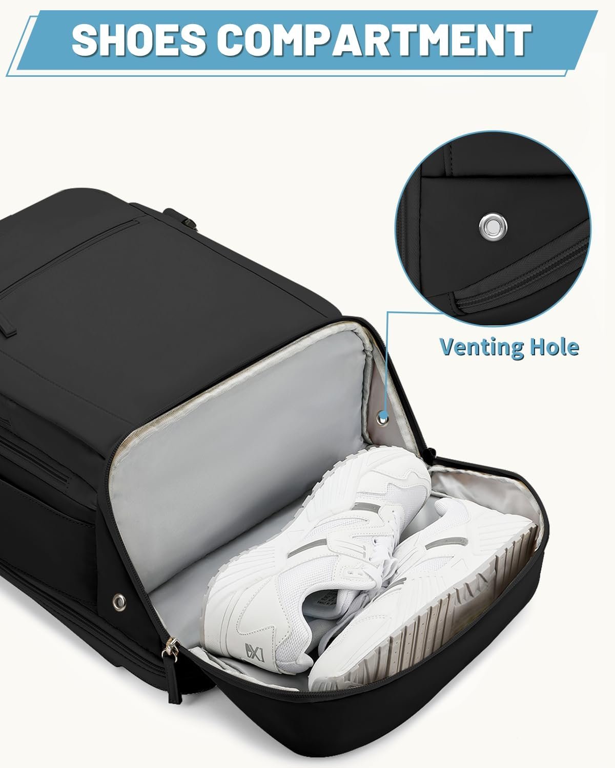 [Wet Pocket &Shoes Compartment]-Traveling backpack features a fully high-density waterproof wet pocket can help you to separate wet clothes or towel after stay in a hotel or apartment more convenient. And there is an upgraded design, a separated compartment with air holes on the bottom for shoes, can store a pair of slippers or low-top sneakers, allowing you to switch in different states of travel, business trips and outdoor sports